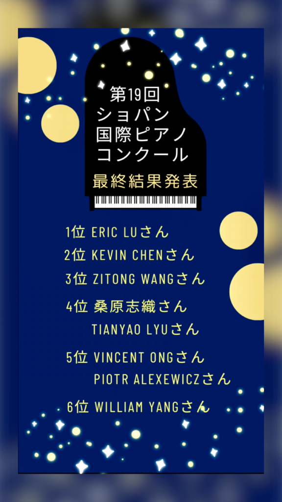 第19回ショパン国際ピアノコンクールの最終結果が発表されました🏅