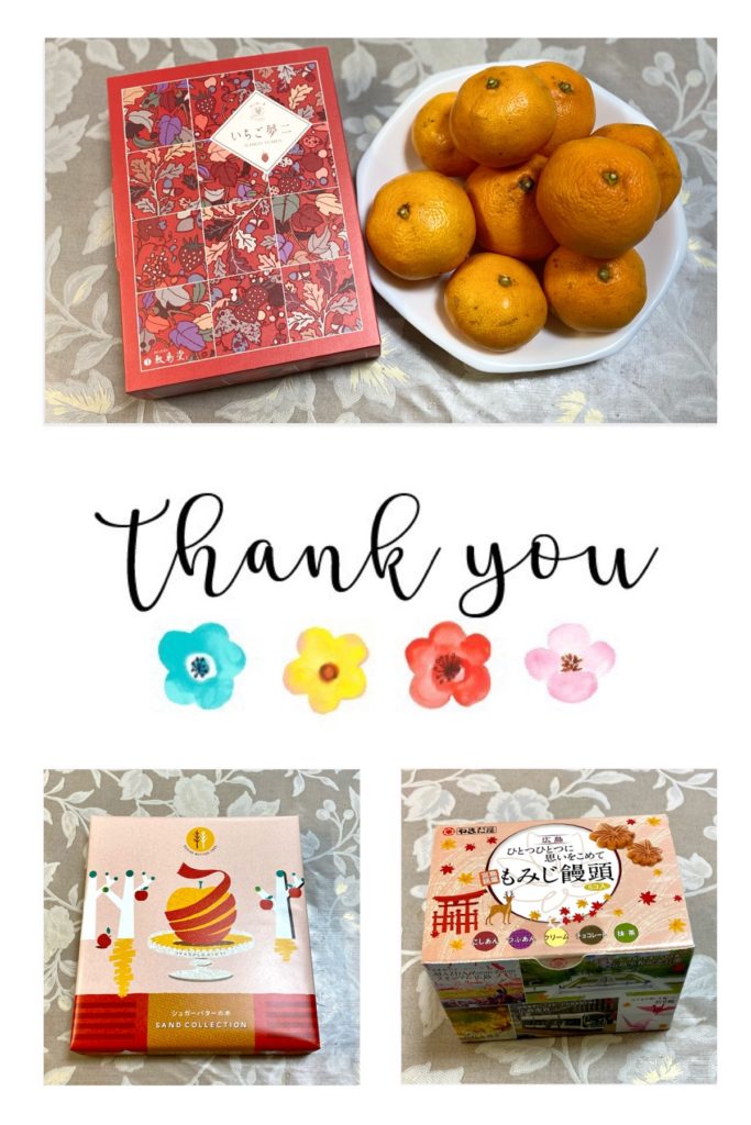 Yちゃんに岡山県のお土産「いちご夢二」とおばあちゃんが育てたみかん🍊を、S君に千葉県のお土産「シュガーバターの木」を、そしてSちゃんには広島県のお土産「もみじ饅頭」をいただきました✨