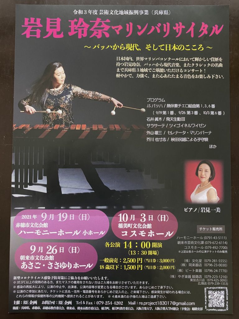 明後日、10月3日(日) 14時〜稲美町文化会館コスモホールにて「岩見玲奈マリンバリサイタル」が開催されます✨当日はワタクシ、恩師のピアノ伴奏の譜めくりと影アナを務めさせていただく事になりました♪